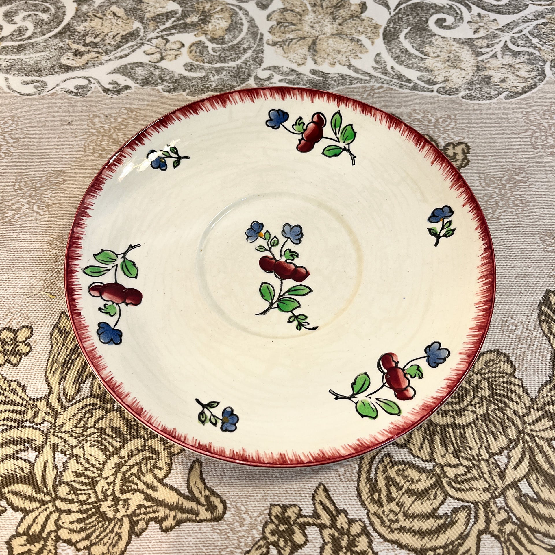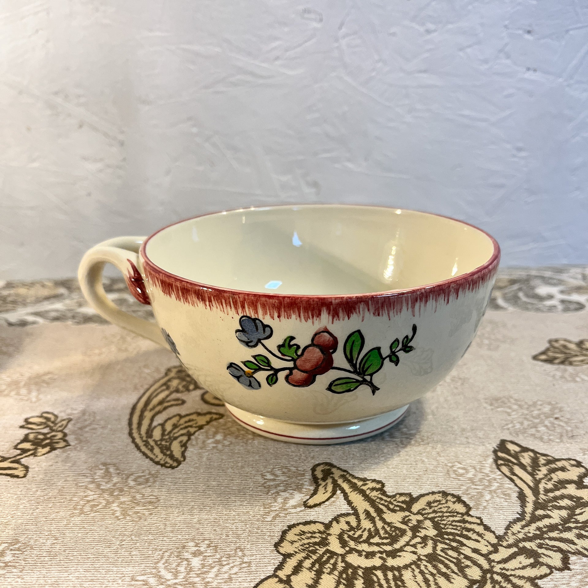 « Tea time » avec ce très joli ensemble composé d’une tasse à thé et de sa soucoupe de la manufacture de Gien. Décor composé de fleurs et d’une bordure délicate couleur bordeaux. À remarquer, la forme originale de l'anse. Parfait état.